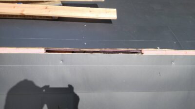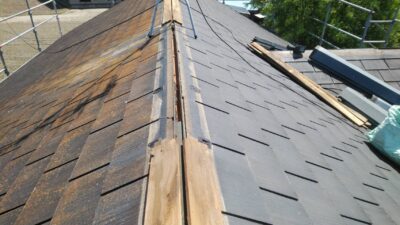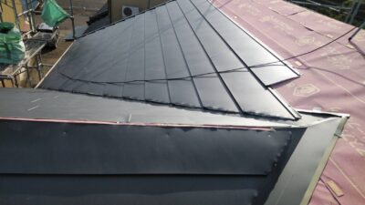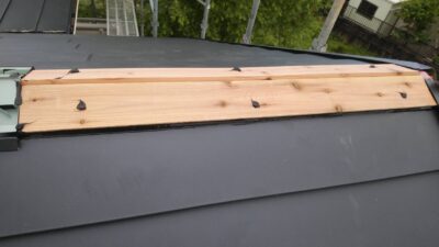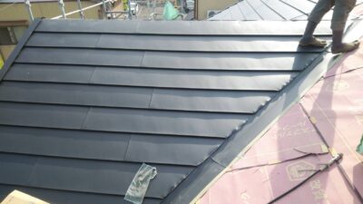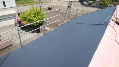 ルーフィング(防水シート)が破損していないので、下地のラーチ合板はしっかりしているので、カラーベストの上にルーフィングを張り、その上に新しいガルバリウム屋根を重ねて行きます。