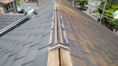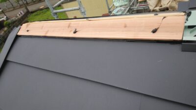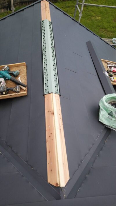 棟の下地を、貫板で作ったら、棟を取り付けて行きます。