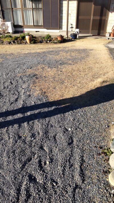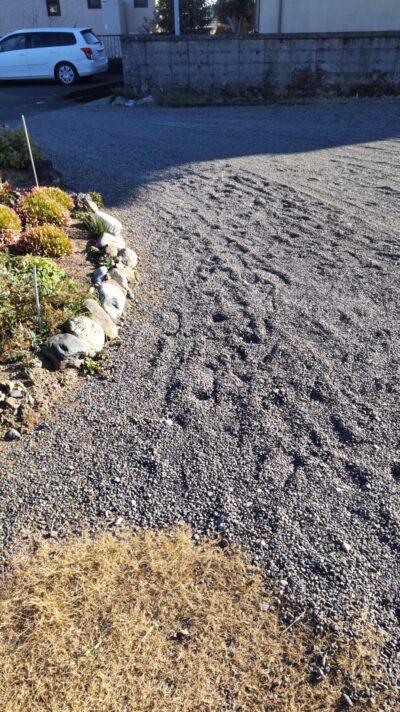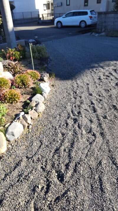 お問い合わせを頂いた庭の舗装の現調に伺いました。奥様と色々と話をさせて頂き一番困っていることは荷台や一輪車で物を運ぶ時にタイヤが砂利に埋まってしまい動かないとの事でした。ご提案は幾つか出来そうなので改めてご提案させて頂きます。