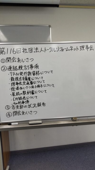 今月はメーカーさんの出席が無い月でトータルリフォームネットの支部長又は理事のみの参加となりましたが議題が多くタイトなスケジュールのなか後半は休憩を取る事も無く内容の濃い会議になりました。