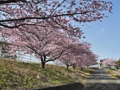 焼津の桜名所のひとつ、朝比奈川左岸沿いの河津さくらが綺麗に咲き、賑わっています。