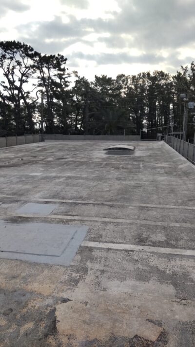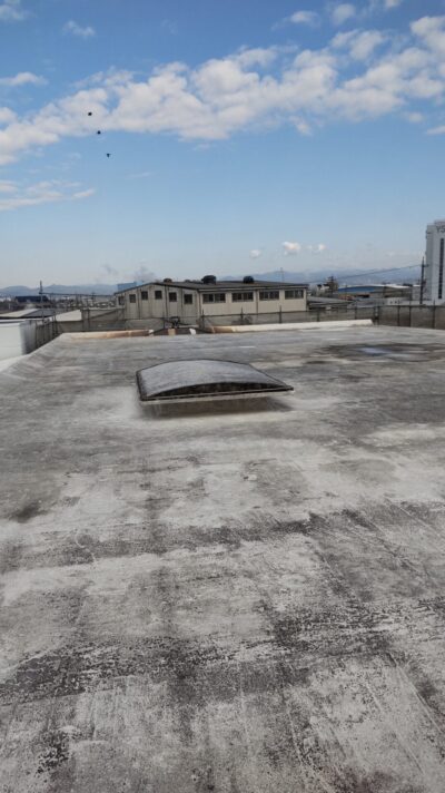 今回お世話させて頂く現場は二棟あるホテルの屋根改修工事です。一棟は陸屋根でFRP防水仕様、もう一棟は折半屋根となっており一次工事と二次工事と分けて施工致します。最初に陸屋根の方から手を入れさせて頂きます。