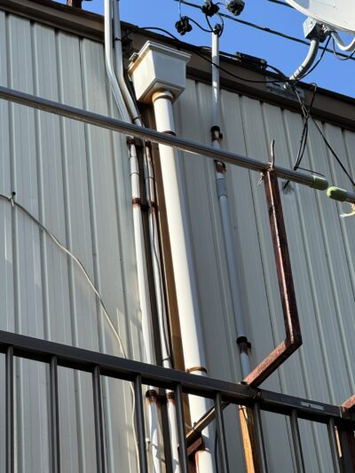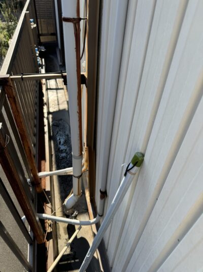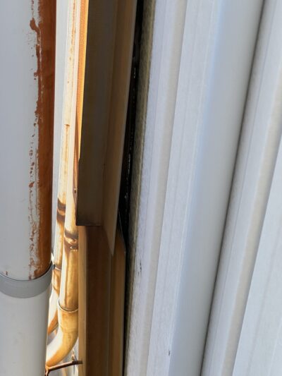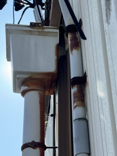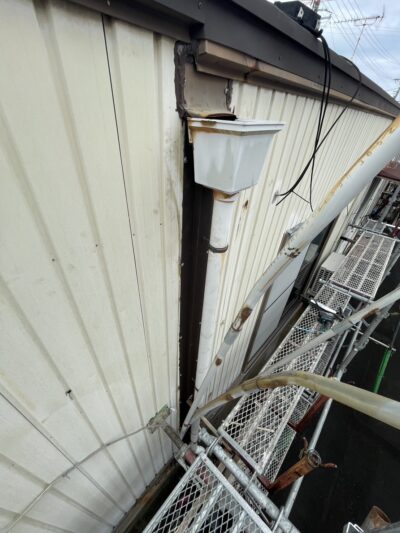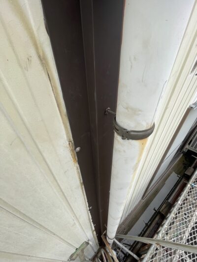 外壁と外壁の繋ぎ目を隠す板金があり、そこに雨樋が取り付けられていましたが、長年強風などで何度も揺さぶられ隙間ができていました。