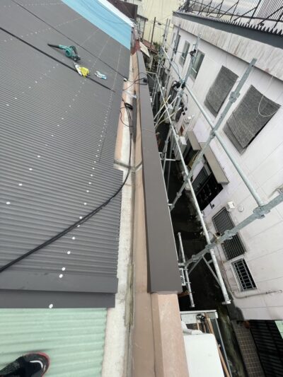 外壁と外壁や繋ぎ目には新規下地と板金施工して隙間を無くし、笠木の頂点に打ち付けてあったアングルは一度外し新規笠木板金施工してから、問題のアングルは笠木の横に打ち付けてビス穴から外壁内に侵水しないように再度取り付けました。