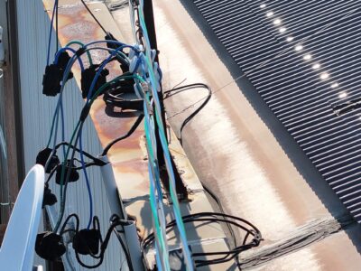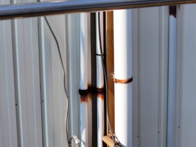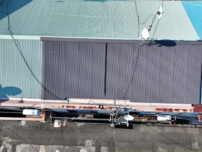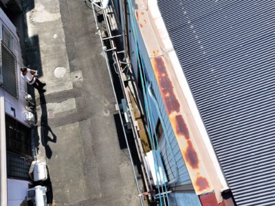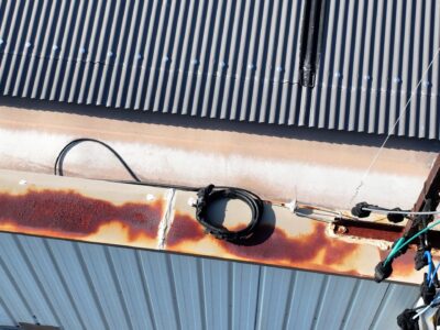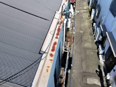 問題の雨漏りしている壁際の屋根の笠木(外壁と内壁の蓋の役割)は古い錆びた鉄板が張ってあり、笠木の上に電気の呼び込み線を固定する為のアングルが打ち付けてありました。これでは、アングル固定のビス穴から笠木内部に水が侵入して外壁の中に入ってしまいます。