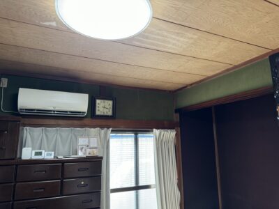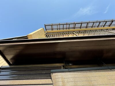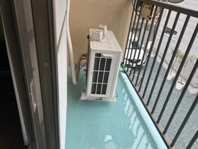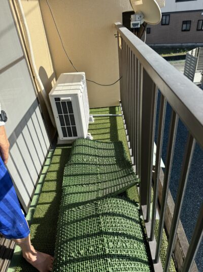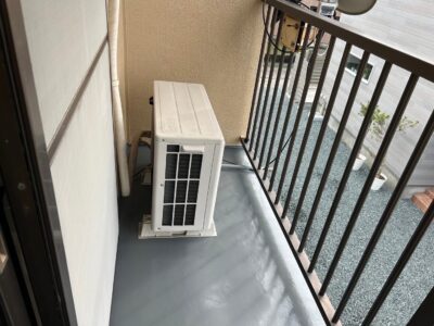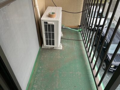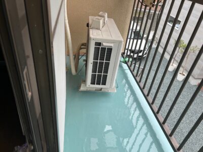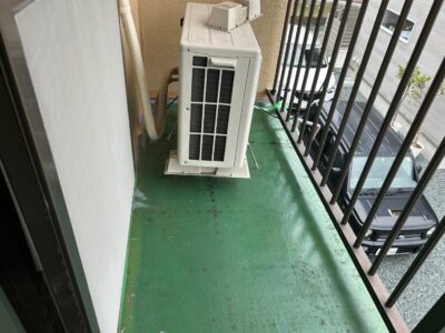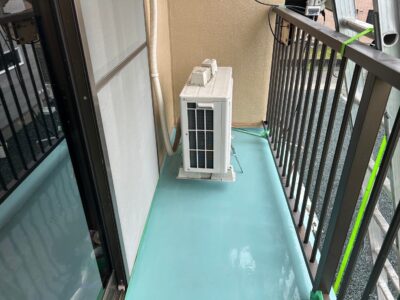 まずは施工面に載っているエアコン室外機を上から吊って浮かし、下地清掃、研磨、プライマー塗装して