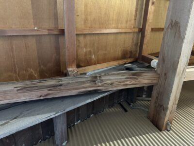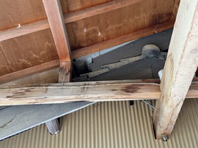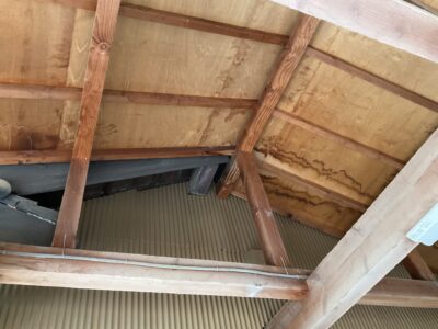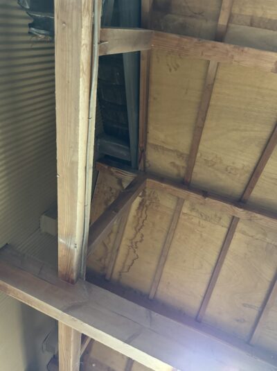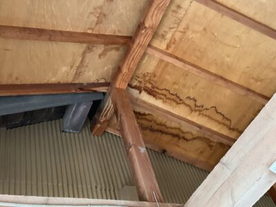 前に母屋の施工でお世話になったお宅から、脇屋と小屋の間から雨漏りがするとご連絡いただき現場確認してきました。昔から強い雨や風が伴う雨では雨漏りしていたとの事ですが、最近はそこまで大雨では無くても雨漏りするとの事です。