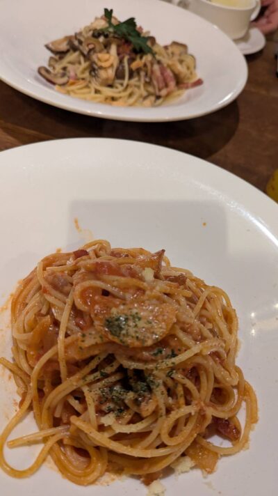 お友達は、きのこのたくさん入ったベーコンキノコガーリックをシェアしながらお得に食べました。