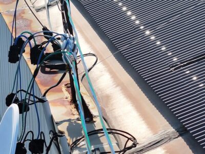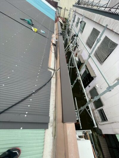問題となっていた壁際の屋根部分には、経年劣化した鉄製の笠木が設置されており、さらに、その上から電気配線を固定するためのアングル金具が取り付けられている状態でした。このアングルはビスで固定されていたため、固定部分のビス穴から雨水が浸入し、笠木内部を伝って外壁内へと水が入り込む構造になっていました。