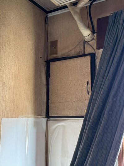 特に収納スペース付近では、天井面に沿って変色が広がり、雨水がじわじわと染み込んでいる状態です。