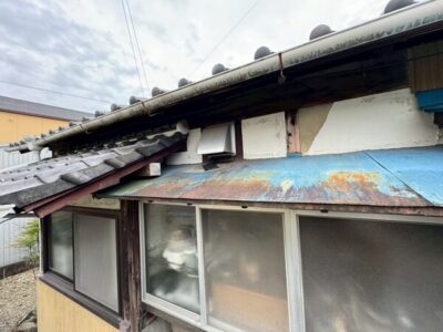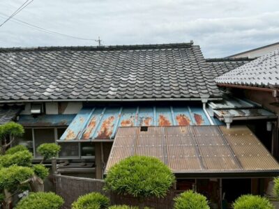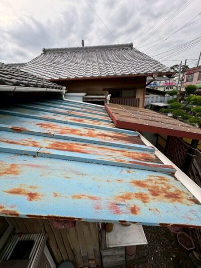 以前、トタン屋根の劣化による雨漏りでガルバリウム屋根の張り増し工事を行った焼津市にお住まいのE様から、再度ご相談をいただきました。「正面のトタン屋根もガルバリウムで被せたい。それ以外の部分は塗装で整えたい」というご要望です。