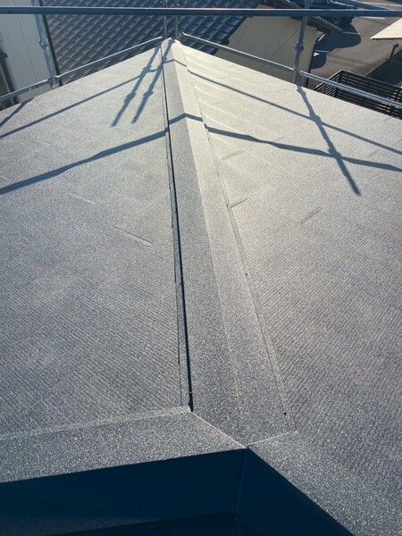 その後、棟下地を施工し、棟板金を取り付けて仕上げます。これにて屋根全体の施工が完了しました。