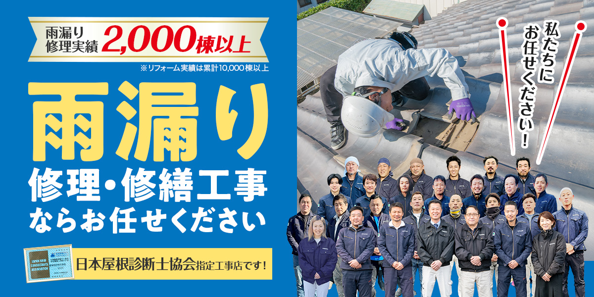 当店では、徹底した雨漏り調査+累計 10,000棟を超える施工実績で、正しい雨漏り修繕工事を行うことで雨漏りの再発防止をしています。目視調査、点検は無料です。まずはお気軽にご相談ください。