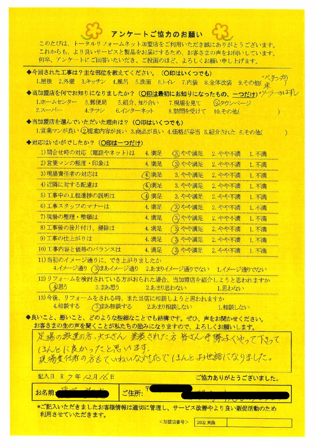 島田市H邸様 ベランダの床・ソーラーはずし工事 足場の設置の方、大工さん 塗装された方 皆さん手際よくやって下さってほんとに良かったと思います。現場責任者の方もていねいな対応でほんとお世話になりました。
